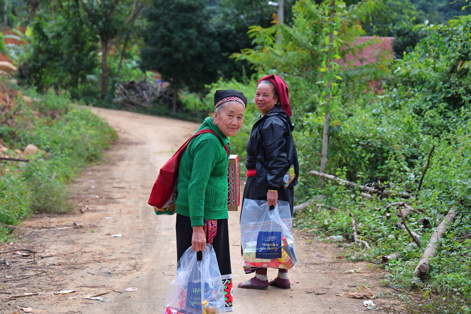 Một trong những người đến sớm nhất là bà Ngân Thị Phong (65 tuổi, người Thái). Bà đi bộ hơn 3 km đường núi – mất gần 1 tiếng rưỡi, dù bị huyết áp cao, tiểu đường và thoái hóa cột sống. “Bệnh nhiều lắm, có các cháu xuống khám, mừng quá,” – bà chia sẻ, tay vẫn ôm chặt túi thuốc và phần bánh sữa sau buổi khám.